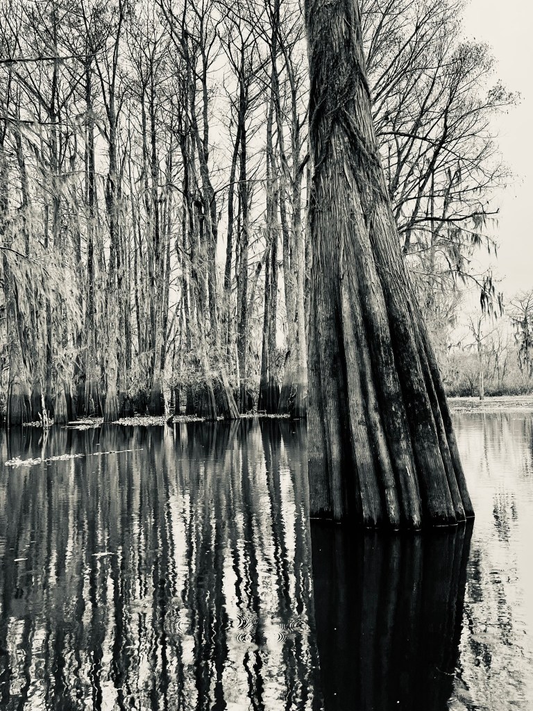 Our last stop before leaving Louisiana was the Atchafalaya Basin, a river swamp area just off the Interstate. In fact, a few miles of the road was built on stilts over the basin. It was so cold anyway, but being on water exacerbated it! It was great though to be going through a forest of Bald Cypress trees and willows on water. Unfortunately, the only real wildlife we saw was an Osprey, with a wonky nest. It was too cold for the alligators who are hibernating right now. Our guide Ronnie described life on the water and how the waterways work. If we were fishermen, we would be able to fish for catfish, crawfish, different types of bass and Red Drum to name but a few, it is a really healthy river.