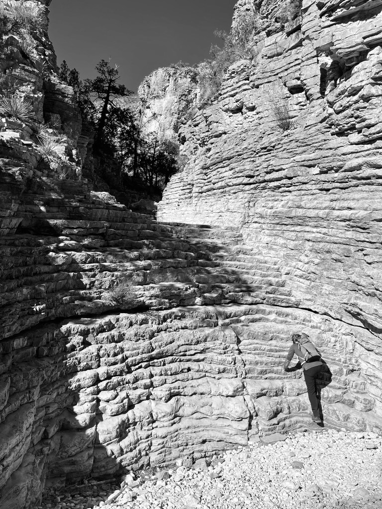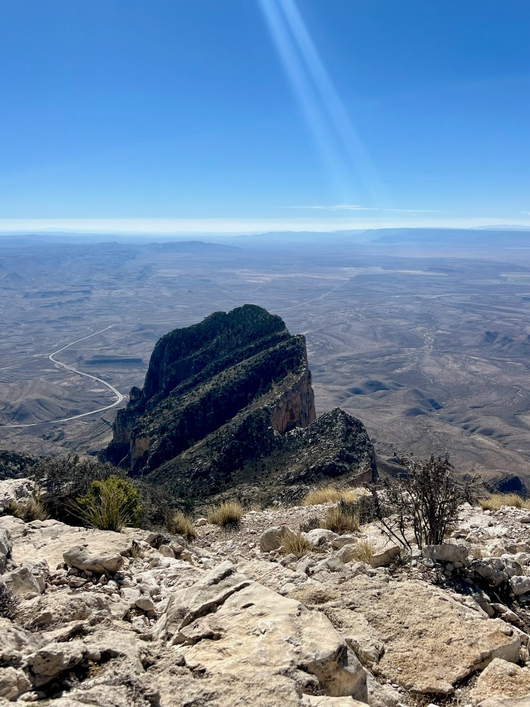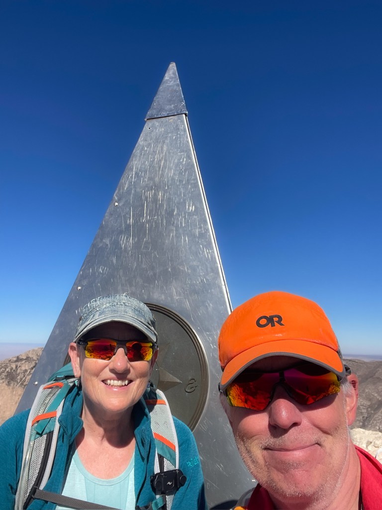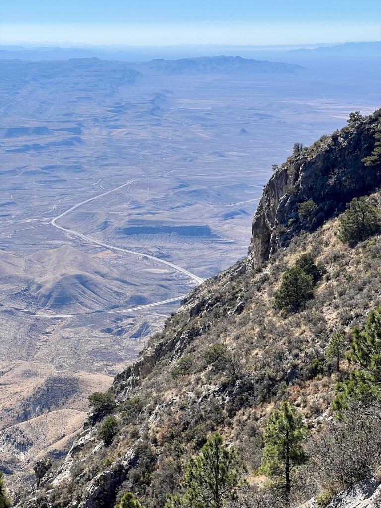 It definitely got very windy; at times I felt it would blow us off the mountain, and I did put my cap away for fear of losing it. As we got closer to the top, we reached a few places where the path was non-existent or, you couldn’t see what was around the next bend, and some big drop offs 🥺 As I have got older these things make me very nervous 😬 But, I really wanted to get the top of Guadalupe Peak so I persevered! I really felt fear. We got to the top and it was extremely windy. Gradually, I relaxed enough to take a few photos, before we started the first and worst part of the descent, which was not as bad as going up, thank goodness!