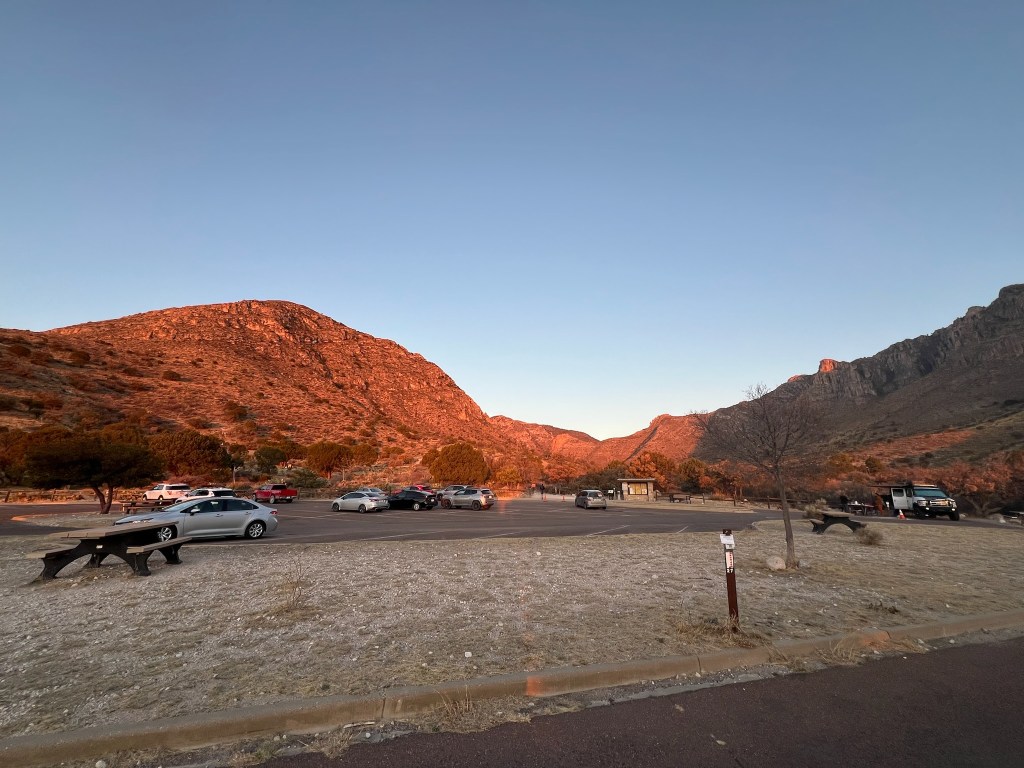 So, we are still in Texas! This time in a National Park, albeit a small one. They have a small campground, well a car park really, for about 20 RV’s or caravans. Facilities are…….. a toilet. It is also a trailhead for several walks, and we liked that, being able to walk from the door. Also, the view was great, we were in a bowl, surrounded by lovely mountains 🏔️