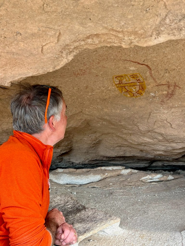 Hueco Tanks (Hueco means hollow in Spanish and refers to the many water holding depressions in the boulders and rocks) is popular for two main reasons, pictographs and bouldering. People get permits to visit the park; when we arrived there was a big queue of vehicles and people who were hoping people had not turned up to use their bouldering permit! It is world renowned as a great bouldering centre. Still, we were here to walk and see petroglyphs and we arrived in time to do our tour. This is a very special park and we had to watch a 15 minute video about the park and how to behave whilst visiting it. The tour was great, and the guide explained about a bit about the history of the park, its uses, people and took us to some great pictographs, rock paintings. It is still considered a sacred place to many Native Americans. The first paintings were created between 6000 to 3000 BC, but most of them were from around 1000 AD by Mogollon Culture. These people moved out about 600 years ago, probably as the area could no longer sustain them. The paintings may have been used in praying for rain.