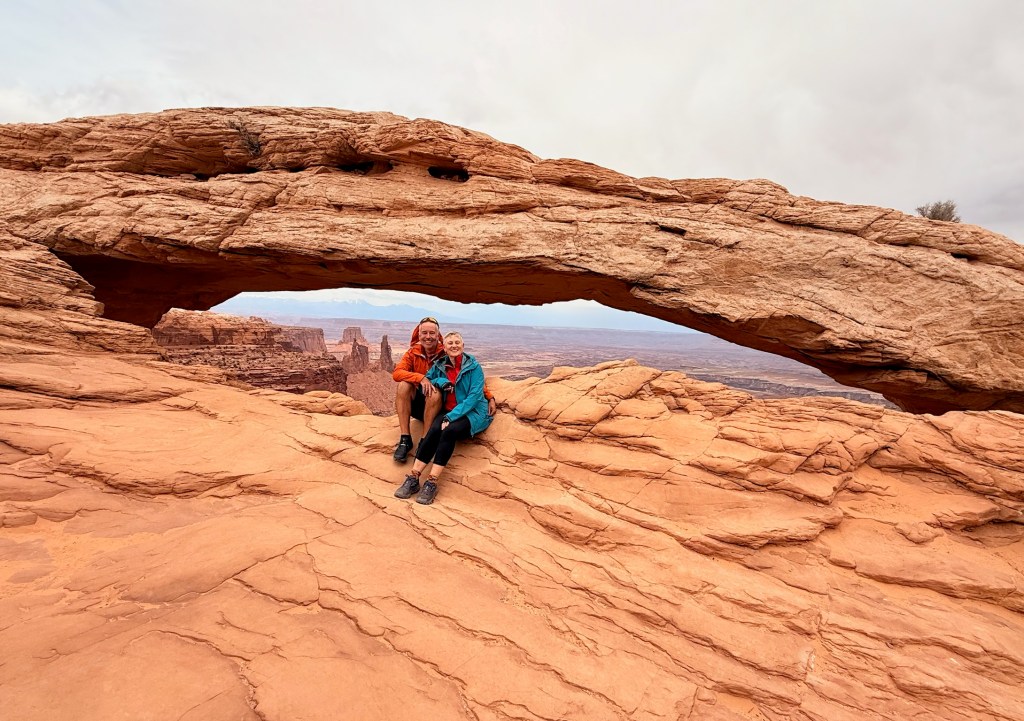 Our first afternoon took us to Mesa Arch, a graceful span perched dramatically above the canyon. It’s a short and accessible walk from the scenic drive, so it’s very popular, but well worth the crowd. A kind fellow traveller offered to take our photo—and we returned the favour, of course.