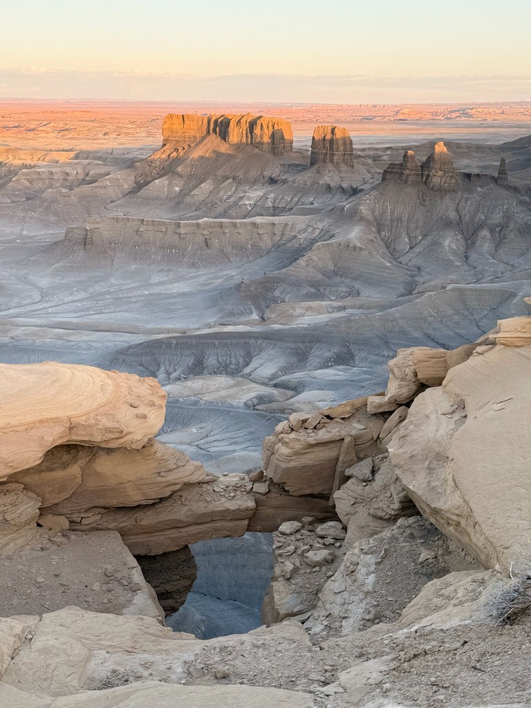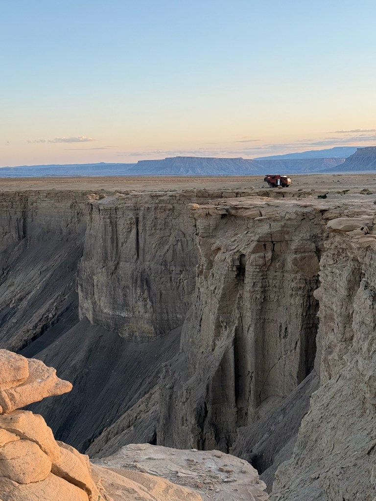 Our next overnight was one we’d been looking forward to: Moonscape Overlook, a remote viewpoint we discovered through a YouTube vlog by A & K. The 8-mile road in was rough—gravel, washboard, and deep ruts—but oh, was it worth it. We arrived in time to blag a good spot to view the sunset, gazing over a vast, grey-blue landscape that truly lived up to its name. It felt like standing on the surface of the moon.