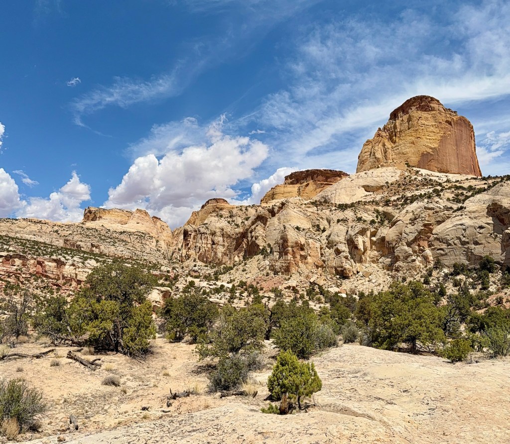 The next day, we set off on bikes toward the Capitol Reef Scenic Drive. To our surprise, it was wonderfully quiet. The route led us to a trailhead for a walk to the base of the Golden Throne, where we were rewarded with sweeping views across the park. All told, we cycled 40 miles that day—and, as is tradition, the wind was against us on the way back! We continue to congratulate ourselves on buying e-bikes. They’ve made cycling not just doable, but actually enjoyable in these wide open spaces.