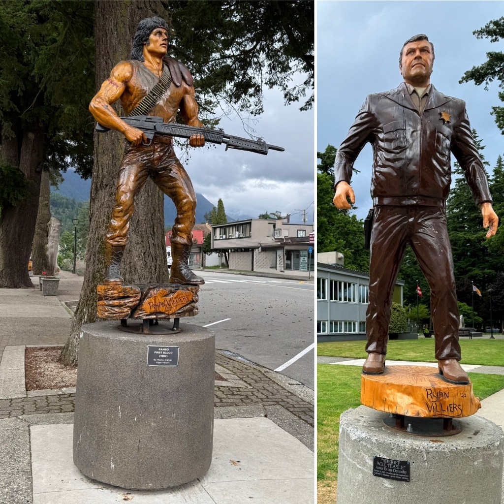 We headed on to the town of Hope, and hoped it would be a good staging point before stopping near Vancouver for some work on Shaun. It provided to be very interesting. We had booked a Harvest Host stay at the Mountainview Brewing Company. It was hosting a party for the inauguration of a new mountain bike Trail, First Blood. We had not realised that Hope was the town used for the setting of the film First Blood, Rambo’s first film. It was fun to walk around the town seeing wooden sculptures of the characters from the film and some of the filming locations. Of course, that night, after visiting the brewery, we watched the film!