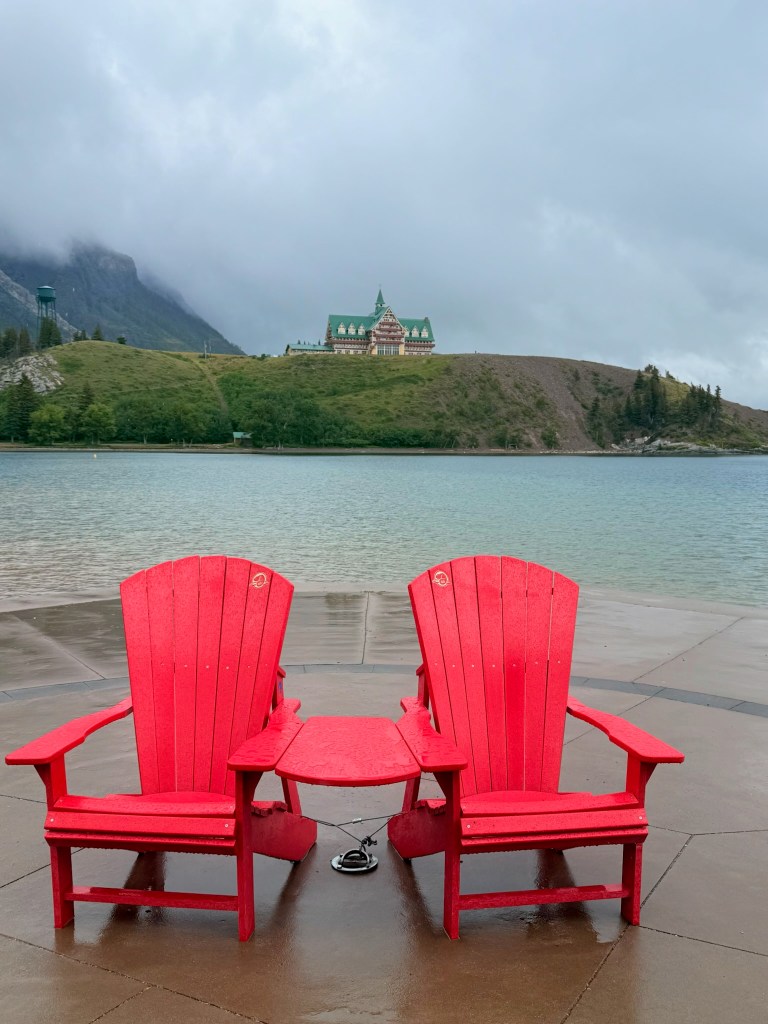 We had a restful couple of days around Waterton Lakes – mainly due to the plentiful rain and chill. It was lovely to see the familiar Canadian red chairs (Adirondack chairs) again as we strolled around the lakeside village and we admired the grand Prince of Wales Lodge, standing proudly with fine views down Waterton Lake, adding a sense of heritage and charm to the landscape.