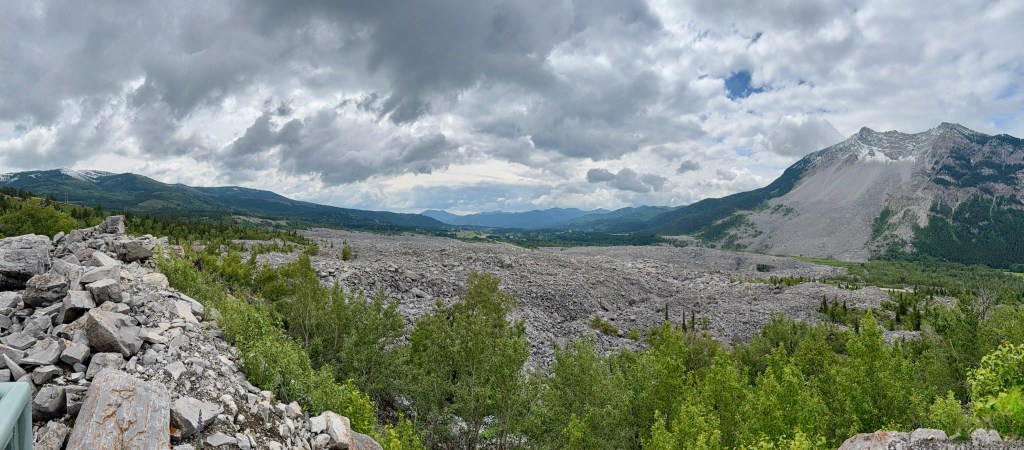 As we travelled along Highway 3, our first major stop was the Frank Slide – a haunting reminder of nature’s power. In 1903, part of Turtle Mountain collapsed, sending a massive rockslide down onto the village of Frank, tragically killing around 90 people. From above, you can still clearly see the vast grey scar – about 3 square kilometres of massive boulders, some the size of houses. It must have been absolutely terrifying, and reminded us of a terrible tragedy in the mining town of Aberfan in South Wales, my home area.