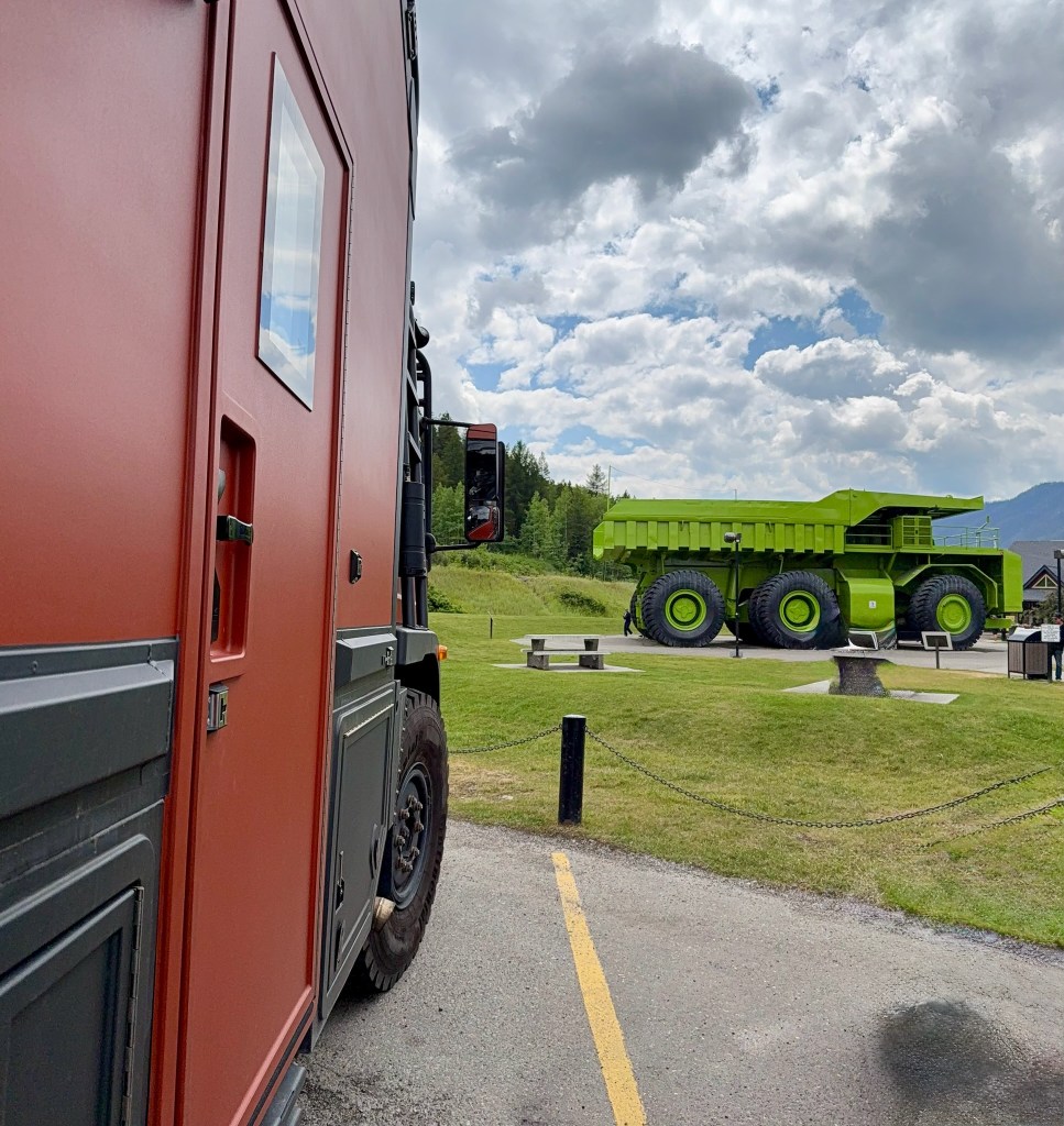 Further on, we came to Sparwood, a mining town that proudly advertises the world’s largest truck. Naturally, we had to stop. The enormous lime-green Terex Titan weighs 230 tonnes and can carry 320 tonnes – it was fun comparing it to Shaun (Shaun is small!)! We had a walk around it, read the info boards, and learned that this area mines metallurgical coal (used in steelmaking), not the kind used for heating homes. It was good to learn about it, especially since we didn’t actually see any open-cast mining on our drive, fortunately.