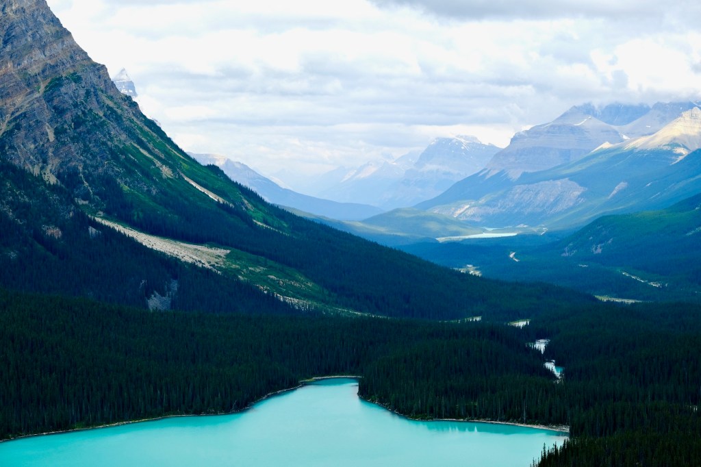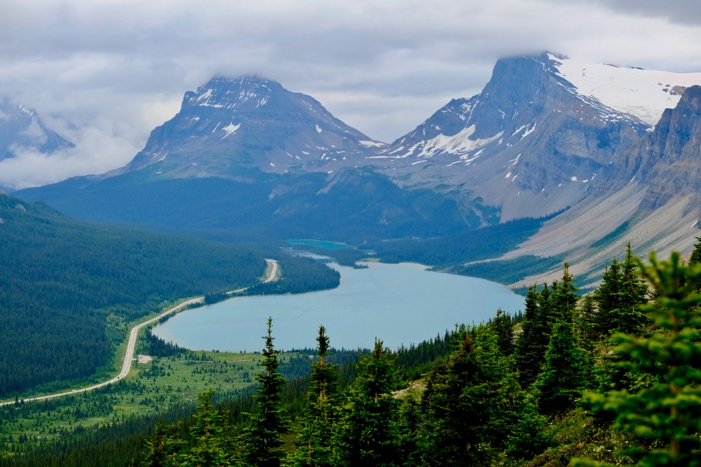 We got back to Shaun and on the road and started the drive along the Icefields Parkway, a famous and scenic 144 mile road between Lake Louise and Jasper. As we drove we passed glacial blue lakes and views of mountains and glaciers. We had managed to get into an official campground with Parks Canada for a night, Silverhorn Creek, and it was delightful, big and open, with great views. The next day, before we drove onto Columbia Icefield we did a walk at Peyto Lake, another stunning coloured lake and walked up to get a view of Bow Lake, beautiful colours all due to glacial melt.