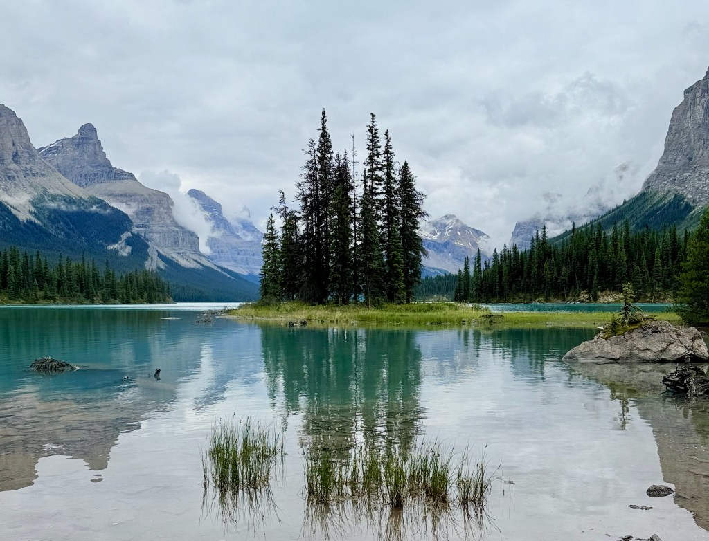 We wanted to visit Maligne Lake, the largest natural lake in the Canadian Rockies at almost 14 miles long, as it looks beautiful and has Spirit Island, one of the iconic sight of the Rockies. The road to Maligne Lake was a strange patchwork: stretches of lush greenery suddenly giving way to charred forest, then back again. It’s the worst fire damage we’ve seen so far, and yet nature is clearly piecing the puzzle back together.