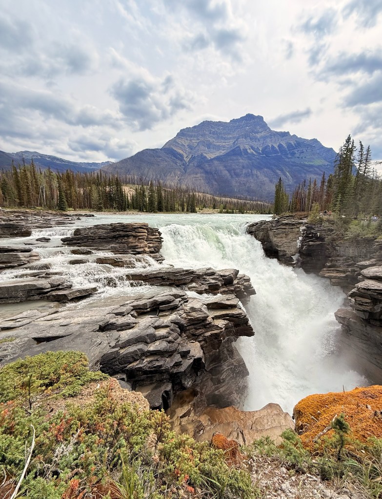 The drive from the Columbia Icefield to Jasper started with a wide glacial valley and easy roads. We soon saw signs of last year’s wildfires — blackened trees and scorched ground — though nature was already fighting back with flowers and grass. We stopped at Athabasca Falls which are powerful and beautiful.