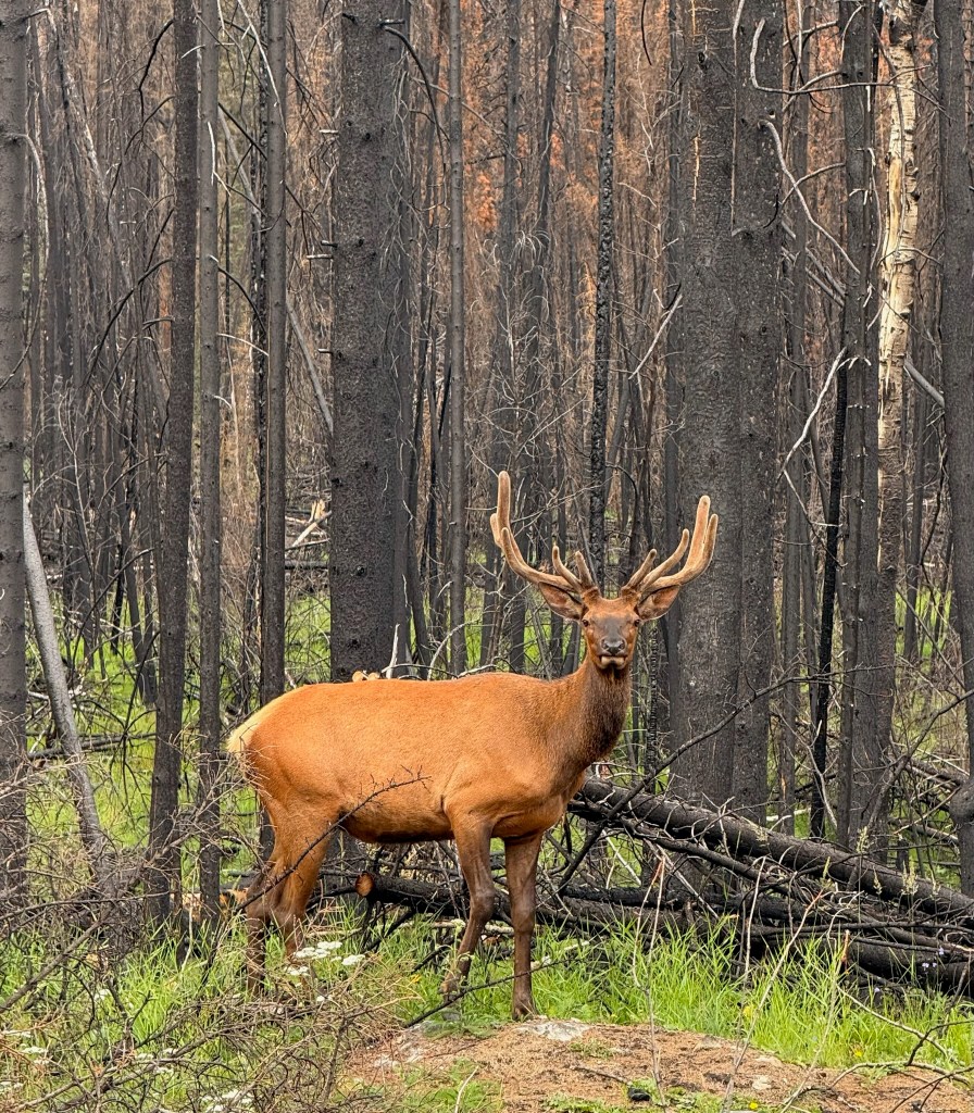 Not long after that, we joined a crowd of cars pulled over to watch two majestic elk in the woods right by the road. Later, we doubled back to a viewpoint we’d almost missed, catching a stunning view framed by both devastation and regrowth.