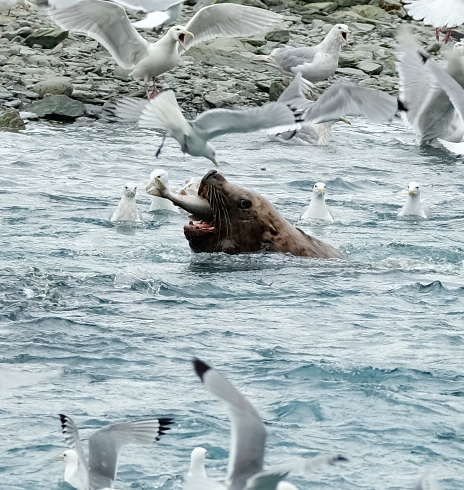 We had been told the Solomon Gulch Hatchery was the place to see a feeding frenzy — and it didn’t disappoint, as the salmon were returning to spawn. Sea lions barked and shook salmon, seabirds wheeled overhead, and then, to our amazement, a bear appeared.