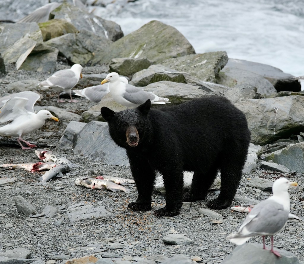 He nonchalantly plucked fish from the stream, tearing them open only for the eggs — a concentrated source of protein — and leaving the remains behind. Afterward, we walked past where he’d been, seeing the aftermath: salmon carcasses split open, gulls and kittiwakes squabbling over scraps. Standing there in the drizzle, with the tide coming in and the sounds of sea lions, birds, and rushing water all around us, it felt like pure, raw Alaska.