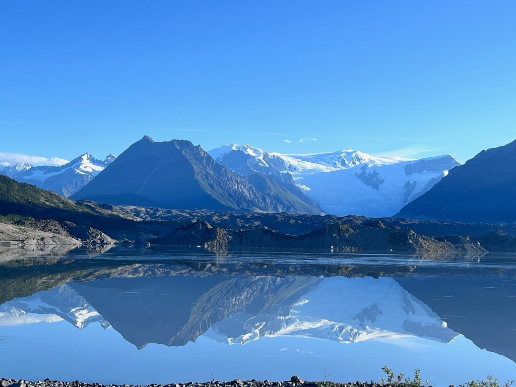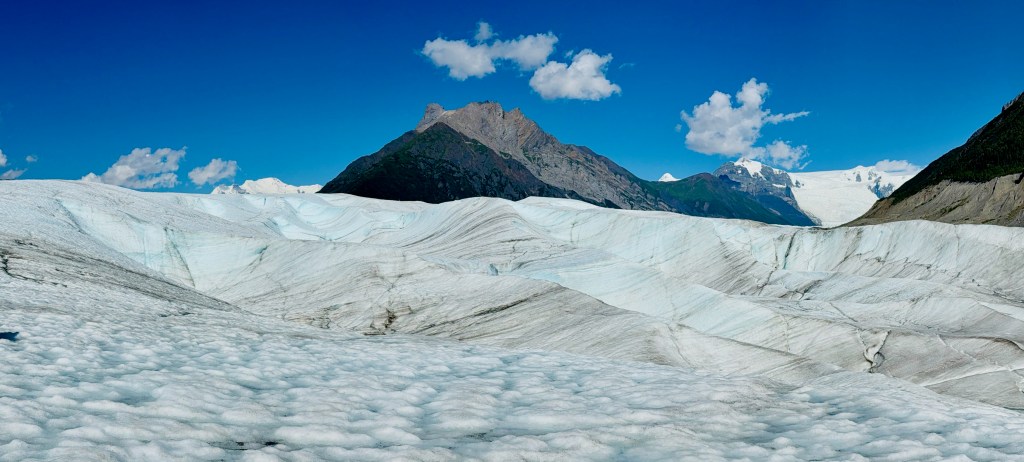 Cycling into Kennecott Village was a highlight. We left our bikes and hiked to the toe of the Root Glacier, strapping on crampons to walk on the ice. Staying on the well-used paths, we explored shimmering blue pools, meltwater streams, and icy waterfalls. Watching the glacier shift from gritty grey to brilliant white and deep blue was unforgettable. Fresh bear scat on the trail there kept us alert — but luckily, no encounters!